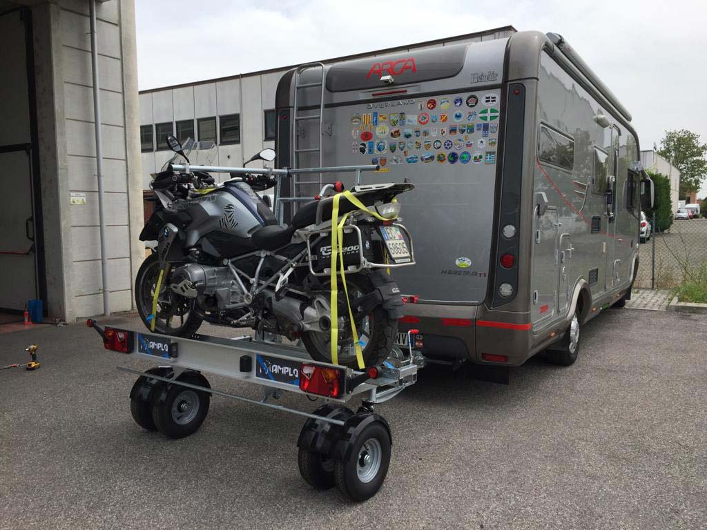 Finalmente gli appassionati delle due ruote non rinunceranno alle vacanze in camper con la propria moto o biciletta. Portata effettiva 300 Kg permetterà agli appassionati delle due ruote di non rinunciare ai viaggi con il proprio camper! Rimorchio trasversale, compatto, con il pratico pianale che si abbassa per permettere di caricare la moto o lo scooter in tutta facilità e sicurezza.